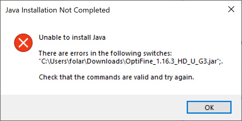 I wanted to install Optifine so I'd be able to have shaders in Minecraft. Everything was fine until I tried to open the file. It said "Java Installation Not Completed" and "Unable to install Java" even tho I've installed it before and there wasn't any error.